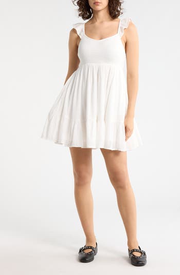 This sweetheart minidress is smocked throughout the bodice and finished with delicate flutter-trimmed shoulder straps, all in airy, gauzy cotton.