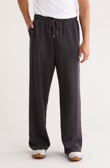 Lightweight French terry fabric brings softness and warmth without added bulk to roomy, straight-leg sweatpants featuring handy pockets and a drawstring waist for a secure fit.