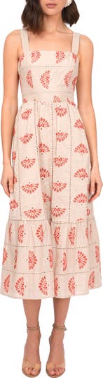Two-tone eyelet embroidery adds brightness and texture to a woven cotton dress complete with a gently gathered skirt.