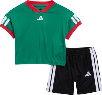 A classic brand motif highlights the jersey T‑shirt and shorts in this athletic set that keeps baby comfy.