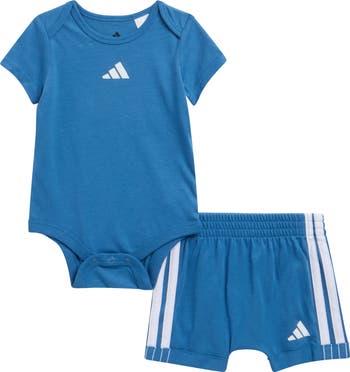 The iconic adidas logo sits front and center on a soft cotton one-piece for infants with a snap closure between the legs for easy diaper changes. This two-piece set also includes a pair of coordinating striped shorts.