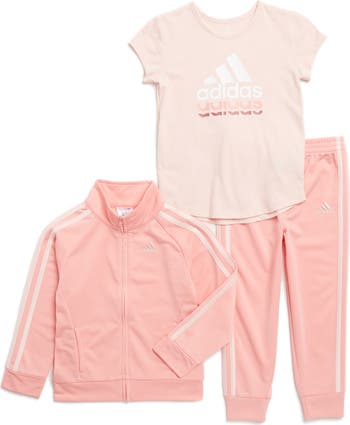 Signature 3-Stripes race down the sleeves of a track jacket and matching pants that are paired with comfortable cotton crewneck T-shirt.