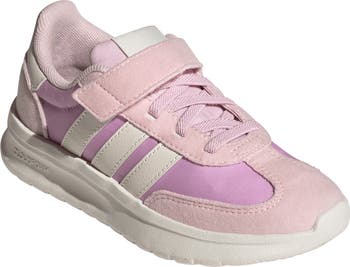 A retro-inspired silhouette brings throwback appeal to a low-top sneaker built with a hook-and-loop strap that continually adjusts to their growing feet.