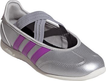 An extralow profile and easy-on/stay-on mary jane strap provide a fresh take on a kid-size ballet sneaker designed with signature 3-Stripes and traditional T-toe.
