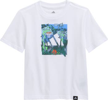 A frond-covered basketball court graphic brings sporty vibes to a kid-approved T-shirt made from soft cotton jersey.