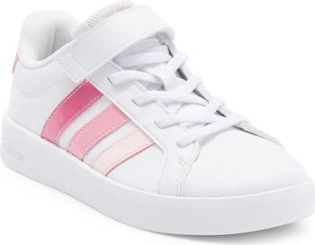 Classic 3-Stripes accent this playground-ready low-top sneaker with a sturdy cupsole and hook-and-loop strap for quick on-and-offs.
