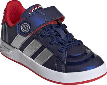 This classic faux-leather court sneaker gets a hero-worthy upgrade with metallic side stripes and bold Captain America branding.
