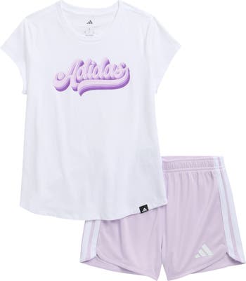 Your active kiddo is ready to take on team practice or just the weekend in the comfort of this sporty set featuring a cotton-jersey graphic T-shirt and a pair of coordinating dolphin-hem shorts.
