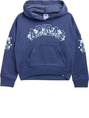 A signature logo marks the chest of this kid-approved hoodie cut from soft, heathered fleece fabric.