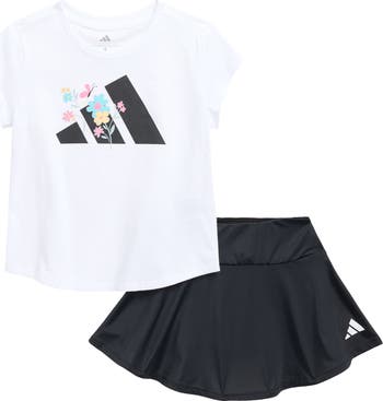 Branded graphics lend heritage appeal to a sporty T-shirt and skirt set that has your budding athlete ready for gameday.
