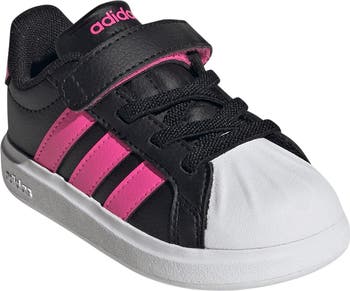 Classic 3-Stripes and a clamshell toe add heritage appeal to this playground-ready sneaker topped with elastic laces and a hook-and-loop strap for a secure fit.