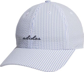 Seersucker stripes lend warm-weather appeal to a sporty baseball cap complete with an embroidered logo and motif for heritage appeal.