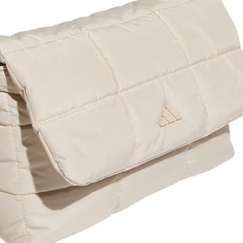 Plush box quilting and a wide, webbed shoulder strap elevate the sporty appeal of this convenient crossbody bag designed with a foldover flap.