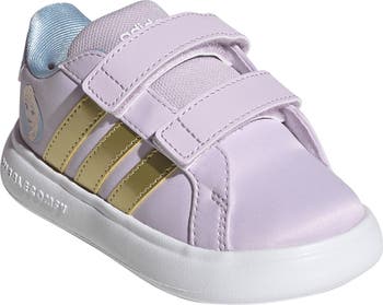 A motif of their favorite Disney character, Elsa, accents the back heel of this low-top sneaker secured with dual hook-and-loop straps for an easy on/off.