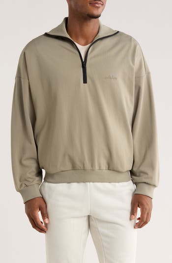 Dropped shoulders further the relaxed fit of this half-zip sweatshirt branded with a suede adidas logo on the chest and a Fear of God one across the center back.