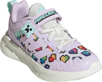 Pixelated details assemble up the sides of an iconic adidas sneaker that's sized for kids and rebuilt for the world of Minecraft.