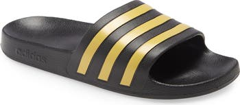 A cushy, contoured footbed puts lightweight comfort under every step in a pair of water-friendly sliders topped with the brand's iconic three stripes.