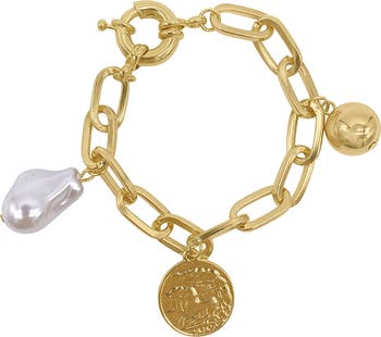 An imitation pearl and coin charms accent a polished chain-link bracelet in 14-karat-gold plating for a touch of elegance.