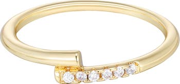 Sparkly cubic zirconia highlight this dainty overlapping bypass ring plated in warm 14-karat gold for elegant shine.