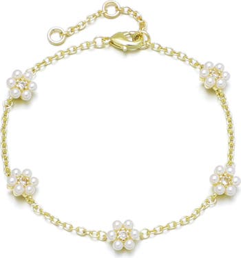 Lustrous faux-pearl and crystal flower stations bring romantic shine to this dainty bracelet plated in warm 14-karat yellow gold.