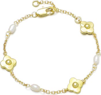 Show off nature-inspired shine with this 14-karat gold-plated bracelet stationed by polished flowers and lustrous freshwater pearls.