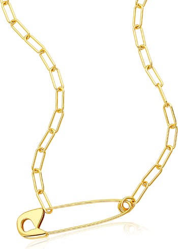 A 14-karat gold-plated necklace showcases a sleek paper-clip chain with an oversized safety-pin pendant for whimsical shine.