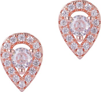 Sparkly round crystals illuminate pear-shaped halo stud earrings plated in warm 14-karat rose gold for romantic shine.