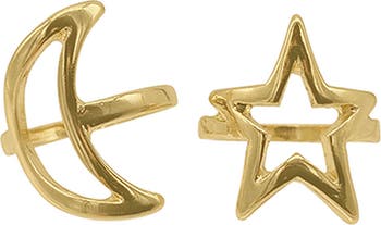 Show off celestial style with this open crescent moon and star ring set finished in gleaming 14-karat gold plate.
