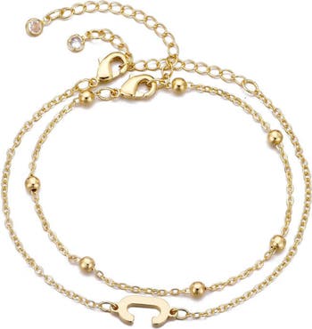 Glossy beads decorate the dainty chain bracelets that feature your choice of initial and a 14-karat gold plate finish.