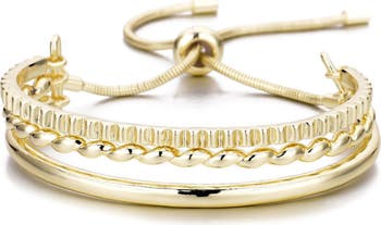 Instantly create a layered look on your wrist with this adjustable cuff bracelet featuring an array of textured bangles.