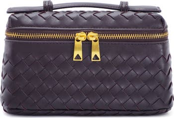 An intricate woven texture lends visual intrigue to a squared off, faux-leather handbag fashioned with a crossbody strap and polished top-handle for versatile carrying.