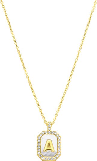 A textured pendant centered with mother-of-pearl and an initial is suspended from a dainty chain necklace and finished in warm 14-karat-gold plating.