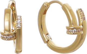 Dainty cubic zirconia illuminate these sculptural huggie-hoop earrings plated in warm 14-karat gold.