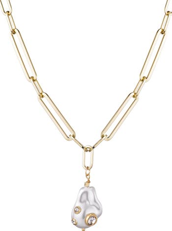 A trio of bezel-set cubic zirconia lights up the tip of a faux pearl from a paperclip-chain link necklace rendered in polished 14-karat gold plate.