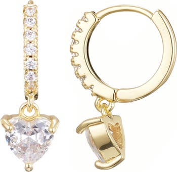 Dazzling pavé and heart-shape CZ bring an elegant flourish to these drop earrings plated in gleaming 14-karat gold.