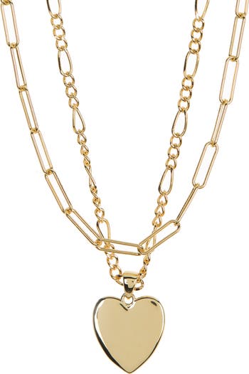 A paperclip chain and figaro chain are layered in this heart pendant necklace for sweet dimension.