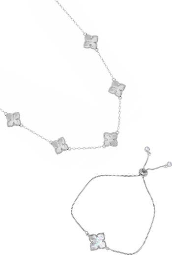 Lustrous mother-of-pearl stones illuminate the clover-shaped stations of a dainty chain necklace and bracelet in icy silvertone plate.