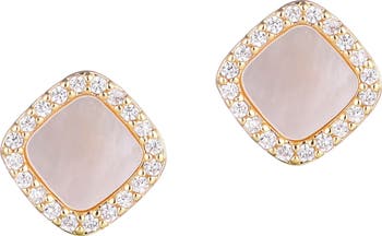 Add an elegant flourish to your look with these stud earrings featuring mother-of-pearl inlay and dazzling cubic zirconia trim and plated in gleaming 14-karat gold.