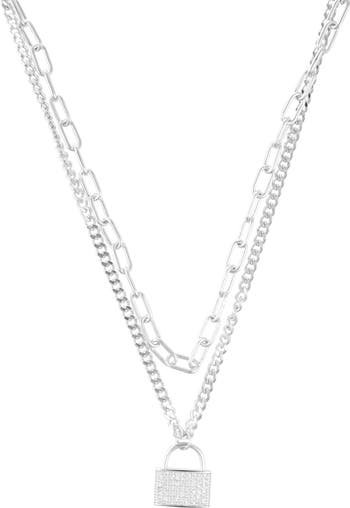 Offering an easy, stylish layered look, this plated necklace features two chain strands with interesting a pavé lock pendant.