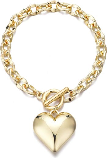 A puffy heart charm adds instant sweetness to a polished bracelet shaped from chunky chain links for visual intrigue.