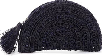Fringe tassels bring a playful touch to this compact half-moon clutch, artfully woven from rich, textured raffia.