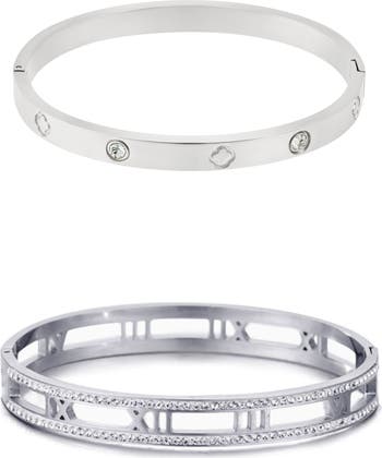 An etched-clover bangle meets an open-Roman-numeral one in this set of bracelets plated in icy silvertone.