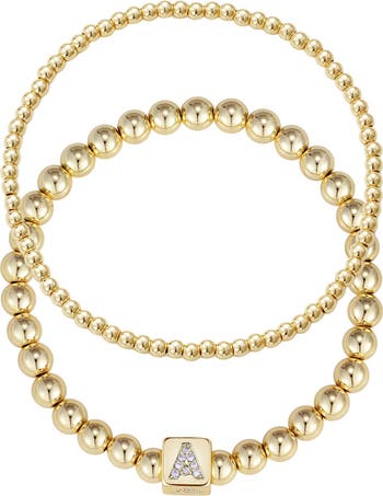 Get that layered look in a flash with this set of gold-plated bracelets, one with gilded beads and the other alight with a sparkly initial.