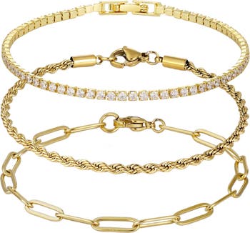 Elevate any ensemble with this set of bracelets featuring a mix of chain bracelets and a tennis one.