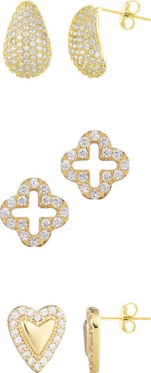 Polish up your daytime or evening ensembles with this assorted set of stud earrings featuring a pavé teardrop, open clover and heart.