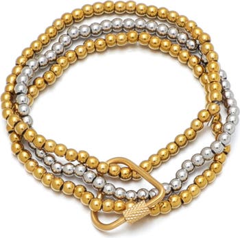 A heart-shaped carabiner frames this set of three beaded stretch bracelets crafted from polished stainless steel and warm 18-karat gold plate.