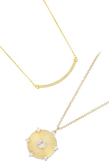Refresh your jewelry collection with this duo of pendant necklaces featuring a curved bar with freshwater pearls and a fluted disc one.