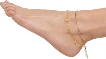 A 14-karat gold plate gives a glossy, gleaming finish to this set of mixed chain anklets.