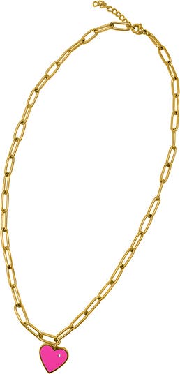 A lustrous water-resistant 14-karat yellow gold-plated stainless steel paperclip chain necklace suspends a pink enamel heart with a dainty crystal accent for romantic style.