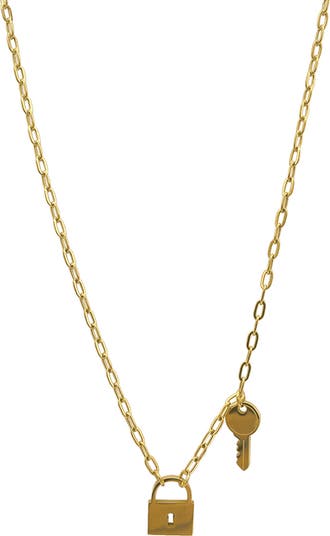 A lock and key pendant adorns a trendy paperclip chain necklace that is crafted from elegant water-resistant 14K yellow gold plating.